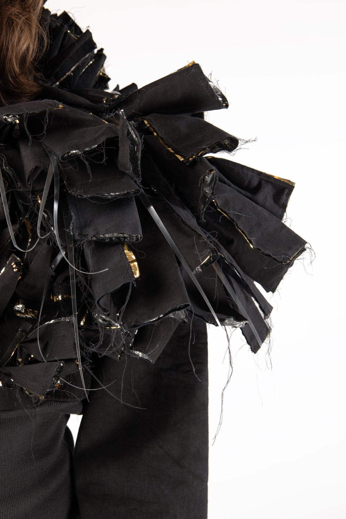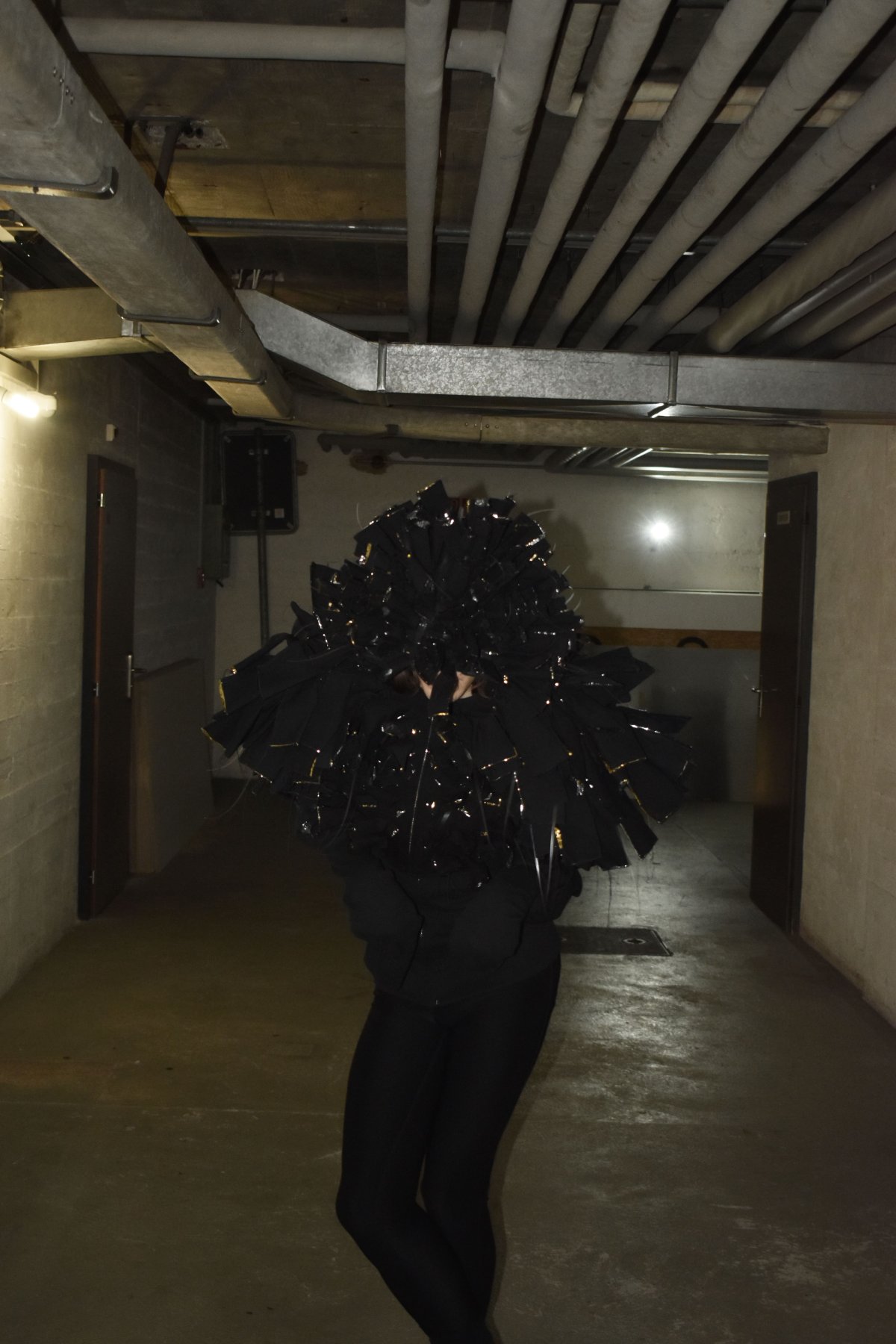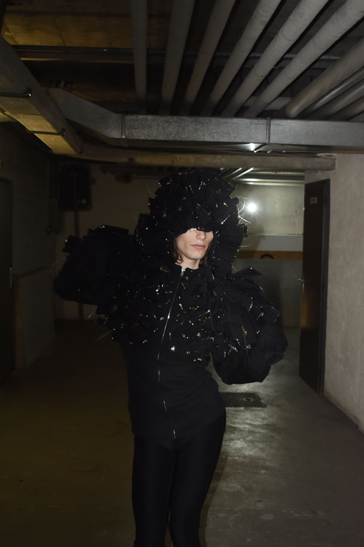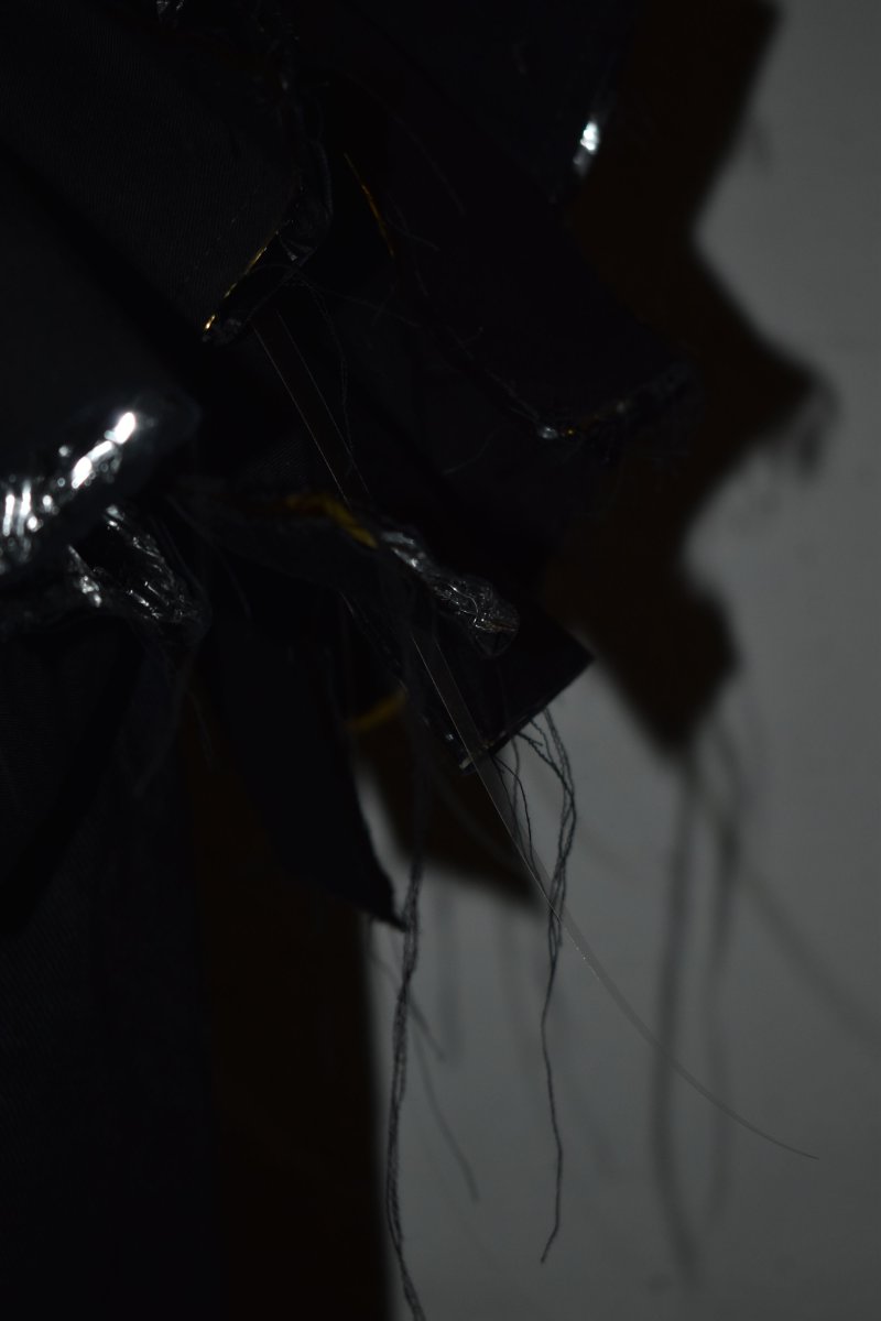 THIS CREATURE PROTECTS ITSELF WITH A FIERCE DEFENSIVE SYSTEM COVERING THE UPPER PART OF ITS BODY : IT WRAPS AROUND THE HEAD, SHOULDERS AND UPPER TORSO. THE JACKET IS MADE FROM A WIDE BASE OF THICK CANVAS DYED BLACK. THE VOLUMES ARE TIGHTENED WITH LONG BLACK RIB-KNIT BANDS. IT MOVES THROUGH OUR WORLD BY WRITHING, ALWAYS ON ALERT FOR POTENTIAL DANGERS AROUND IT. THIS PROJECT CONVEYS THE FEELING OF BEING LIKE AN INHUMAN CREATURE, DISPLACED IN THIS WORLD, OUT OF PLACE.