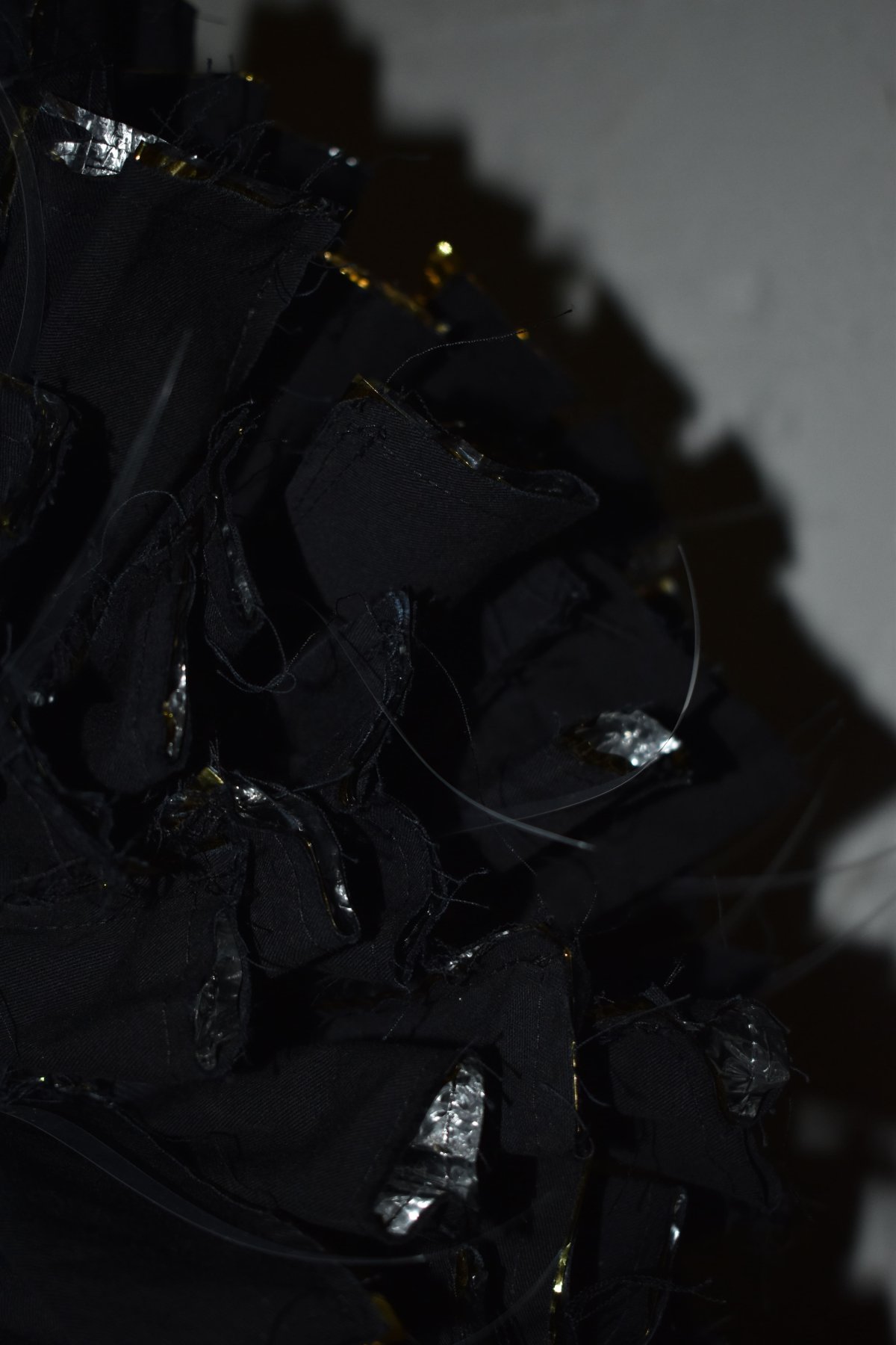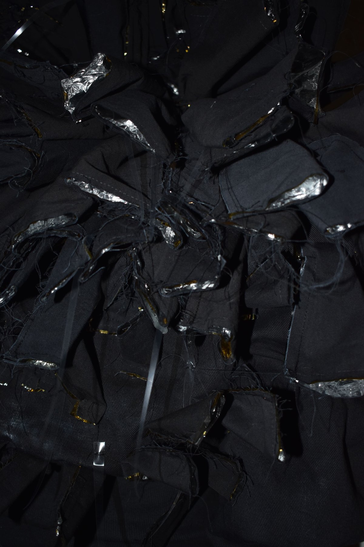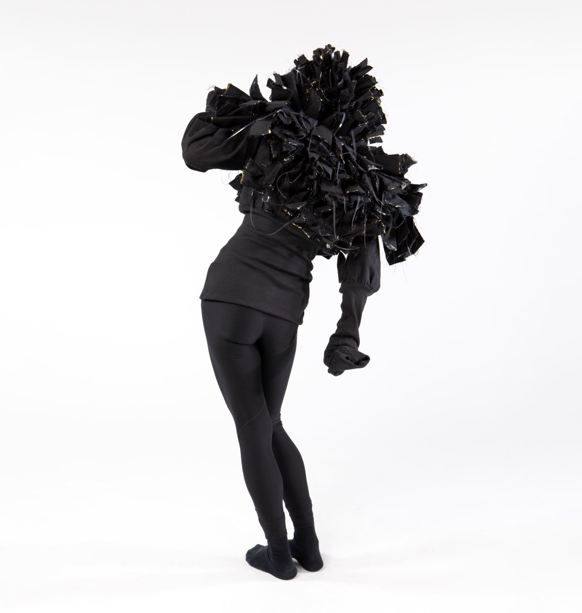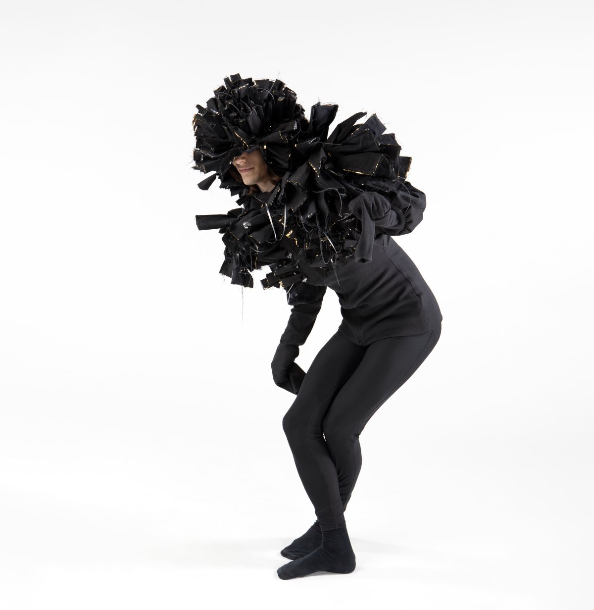 THIS CREATURE PROTECTS ITSELF WITH A FIERCE DEFENSIVE SYSTEM COVERING THE UPPER PART OF ITS BODY : IT WRAPS AROUND THE HEAD, SHOULDERS AND UPPER TORSO. THE JACKET IS MADE FROM A WIDE BASE OF THICK CANVAS DYED BLACK. THE VOLUMES ARE TIGHTENED WITH LONG BLACK RIB-KNIT BANDS. IT MOVES THROUGH OUR WORLD BY WRITHING, ALWAYS ON ALERT FOR POTENTIAL DANGERS AROUND IT. THIS PROJECT CONVEYS THE FEELING OF BEING LIKE AN INHUMAN CREATURE, DISPLACED IN THIS WORLD, OUT OF PLACE.