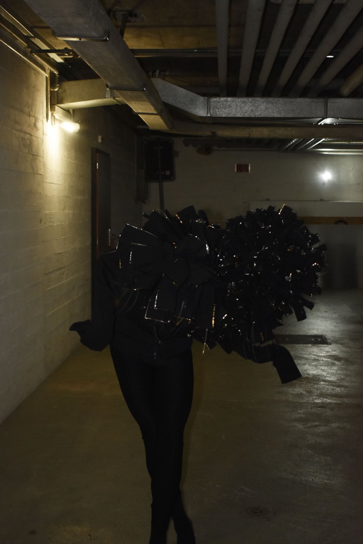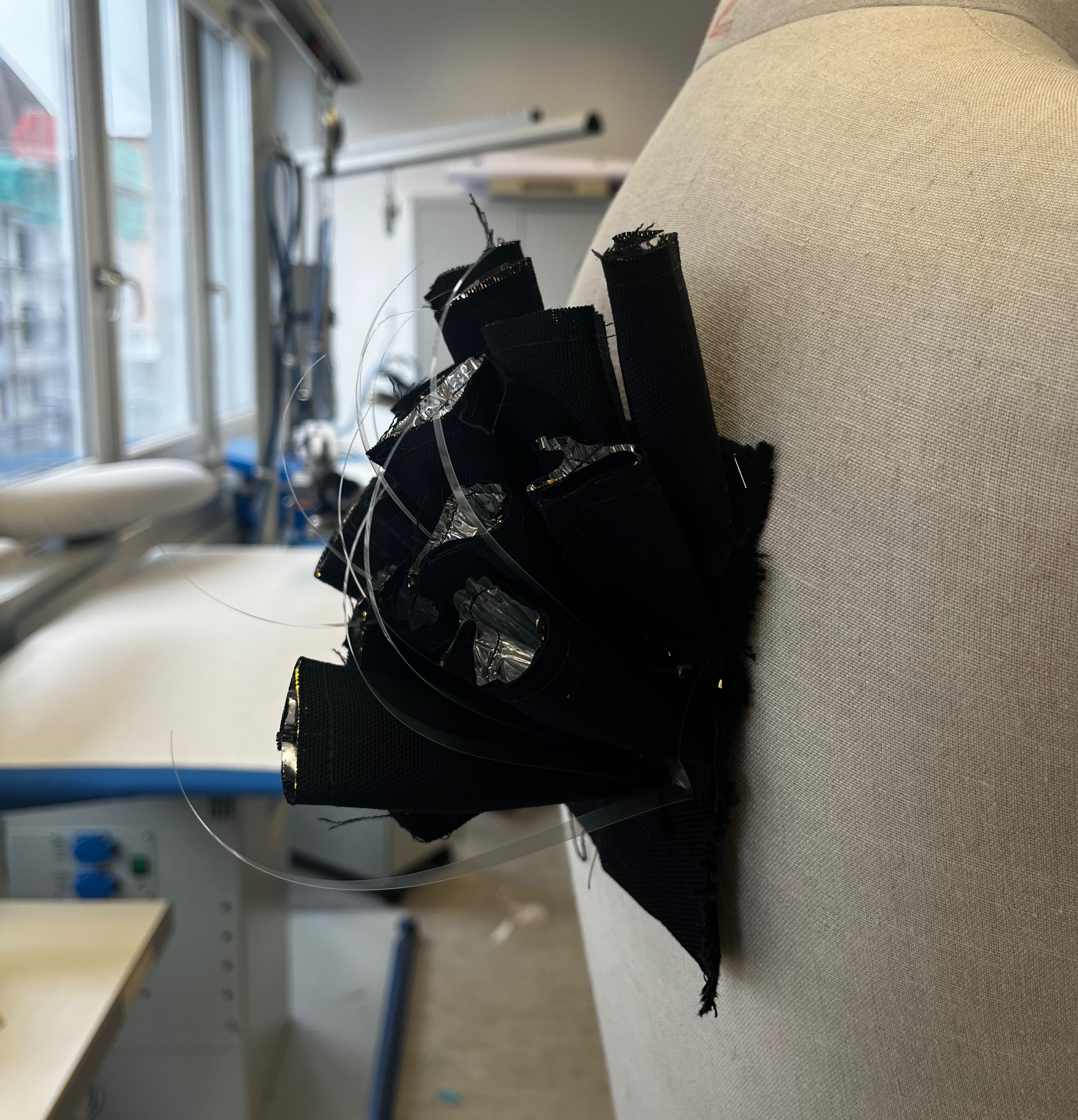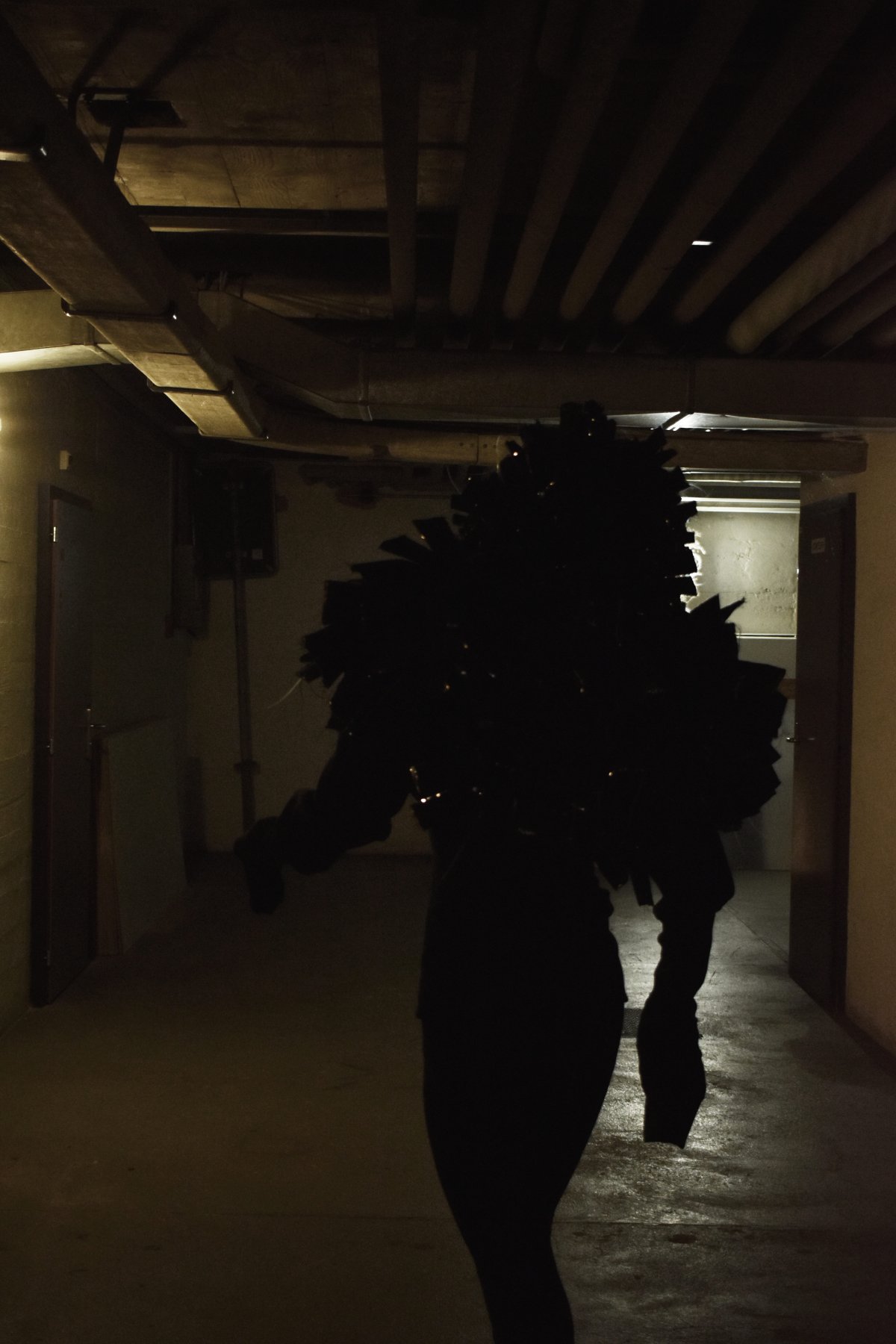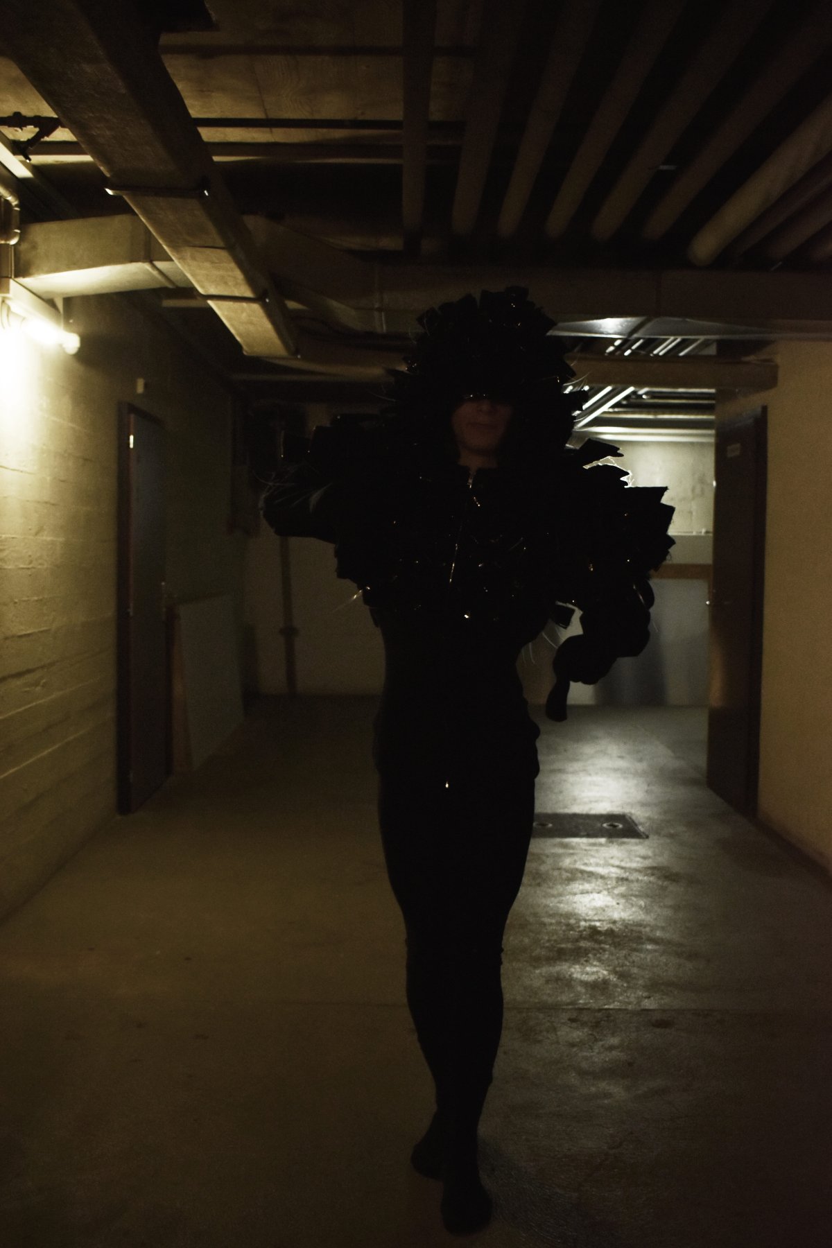 THIS CREATURE PROTECTS ITSELF WITH A FIERCE DEFENSIVE SYSTEM COVERING THE UPPER PART OF ITS BODY : IT WRAPS AROUND THE HEAD, SHOULDERS AND UPPER TORSO. THE JACKET IS MADE FROM A WIDE BASE OF THICK CANVAS DYED BLACK. THE VOLUMES ARE TIGHTENED WITH LONG BLACK RIB-KNIT BANDS. IT MOVES THROUGH OUR WORLD BY WRITHING, ALWAYS ON ALERT FOR POTENTIAL DANGERS AROUND IT. THIS PROJECT CONVEYS THE FEELING OF BEING LIKE AN INHUMAN CREATURE, DISPLACED IN THIS WORLD, OUT OF PLACE.