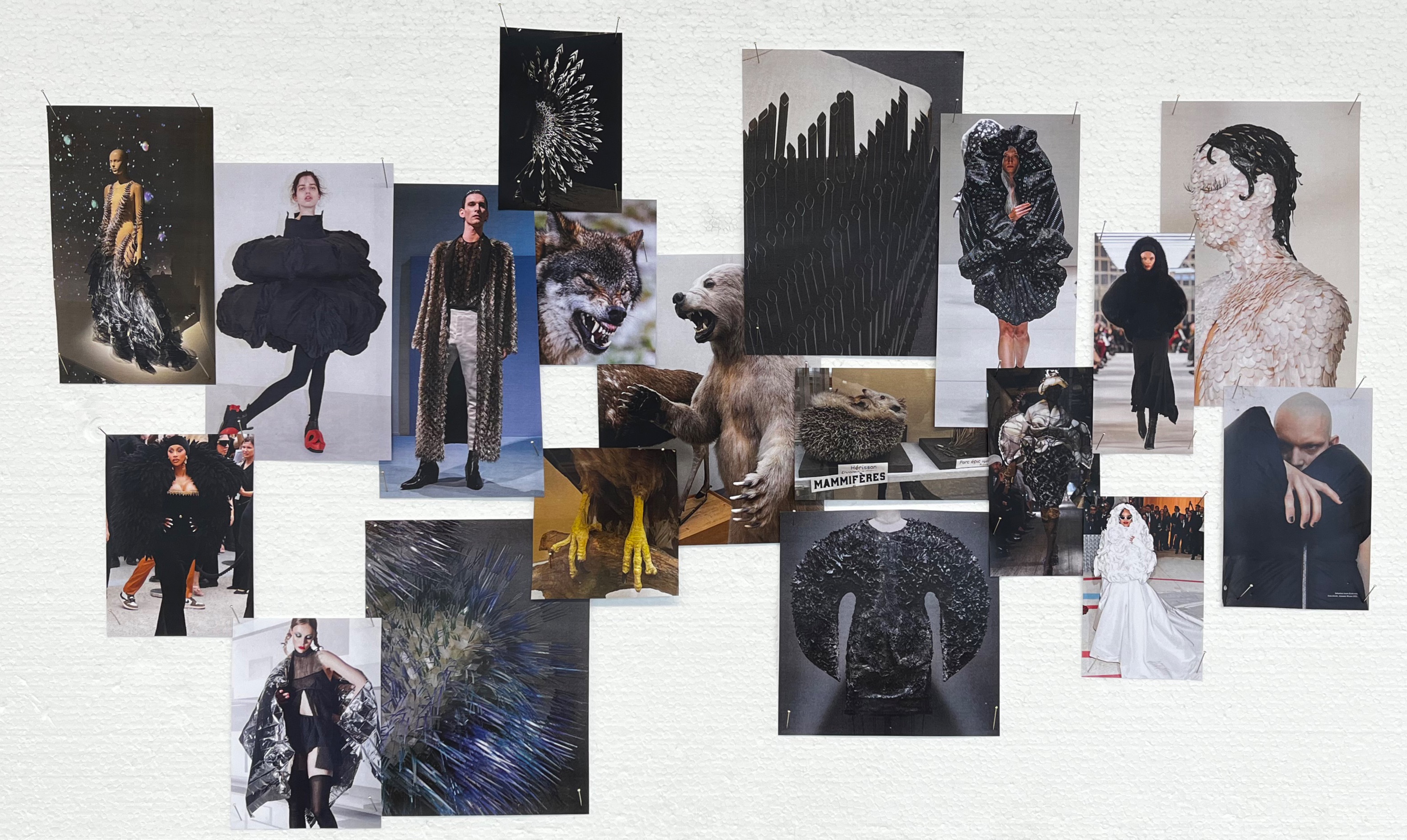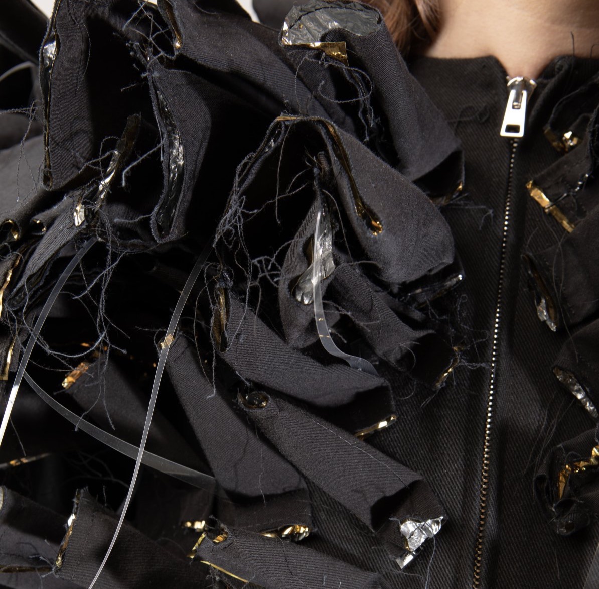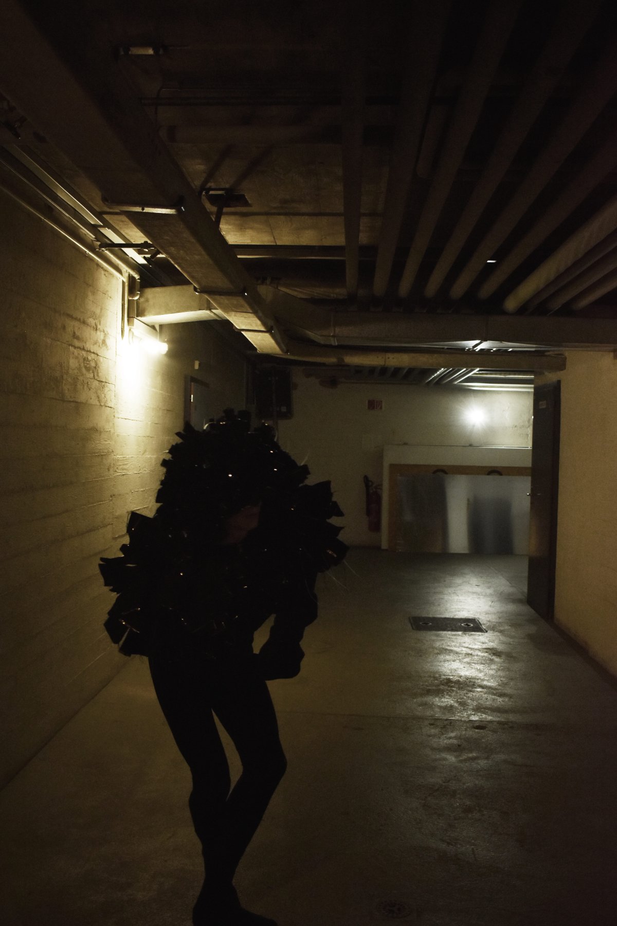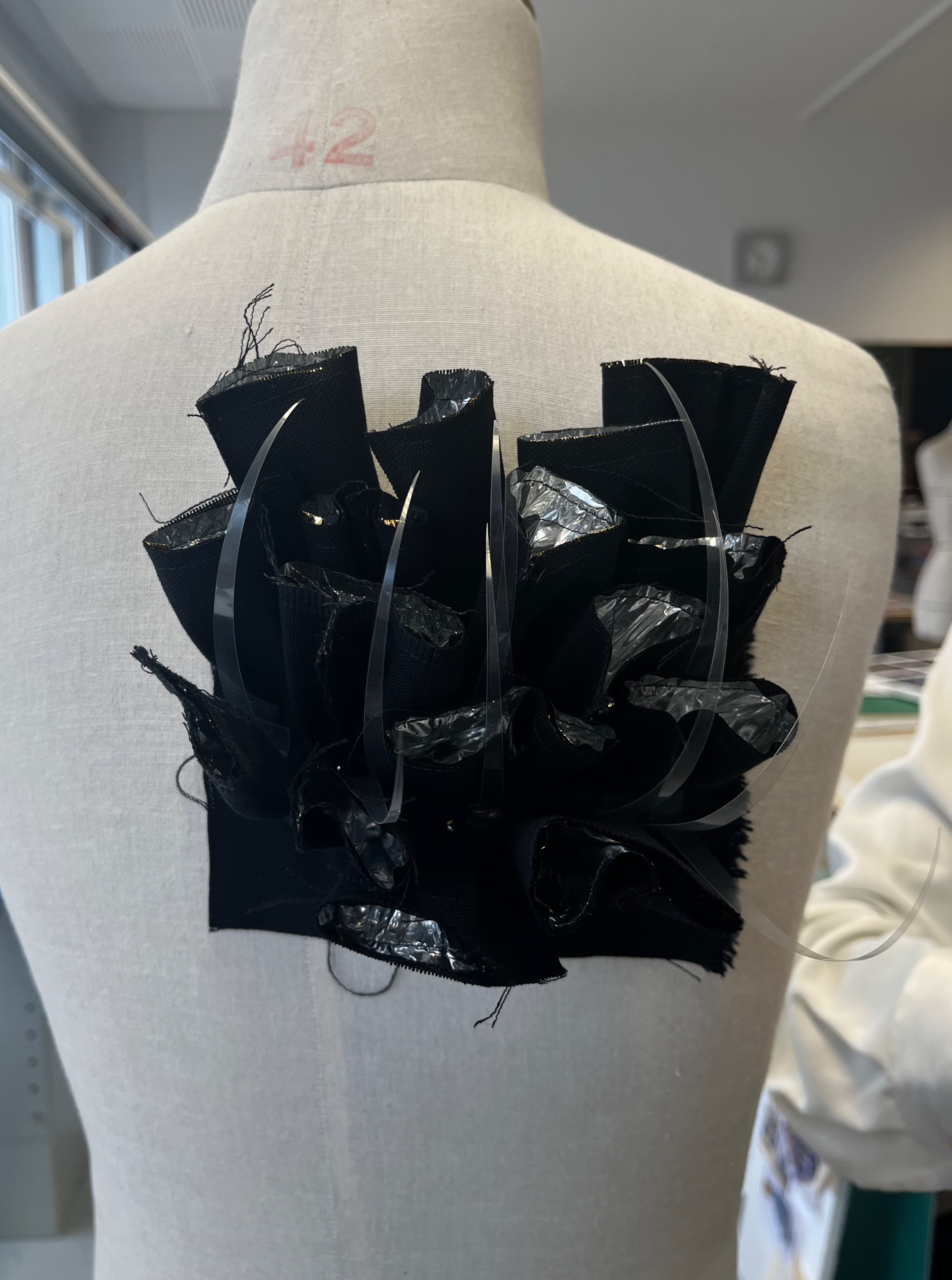 THIS CREATURE PROTECTS ITSELF WITH A FIERCE DEFENSIVE SYSTEM COVERING THE UPPER PART OF ITS BODY : IT WRAPS AROUND THE HEAD, SHOULDERS AND UPPER TORSO. THE JACKET IS MADE FROM A WIDE BASE OF THICK CANVAS DYED BLACK. THE VOLUMES ARE TIGHTENED WITH LONG BLACK RIB-KNIT BANDS. IT MOVES THROUGH OUR WORLD BY WRITHING, ALWAYS ON ALERT FOR POTENTIAL DANGERS AROUND IT. THIS PROJECT CONVEYS THE FEELING OF BEING LIKE AN INHUMAN CREATURE, DISPLACED IN THIS WORLD, OUT OF PLACE.